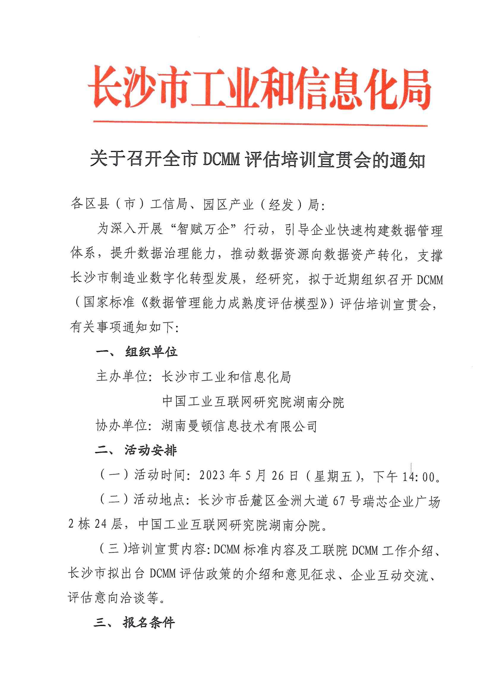 長沙市工信局關于召開全市DCMM評估培訓宣貫會的通知